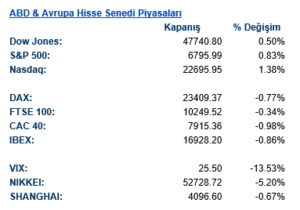 ABD hisse senedi piyasaları günü artıda tamamladı. Dow Jones %0,50 yükselerek 47.740 seviyesine, S&P 500 %0,83 artışla 6.795 seviyesine, Nasdaq ise %1,38 primle 22.695 seviyesine çıktı. Özellikle Nasdaq’taki daha güçlü performans, risk iştahının tamamen kaybolmadığını ve yatırımcıların jeopolitik şoklara rağmen büyüme ve teknoloji temasına geri dönme eğiliminde olduğunu gösteriyor. S&P 500 sektör dağılımı da bunu destekliyor. En güçlü katkı bilgi teknolojileri ve iletişim hizmetlerinden geldi. Teknoloji sektöründeki %1,8’lik yükseliş ve iletişim hizmetlerindeki %1,1’lik artış, endeks toparlanmasının daha çok büyüme hisseleri üzerinden gerçekleştiğini ortaya koyuyor. Sağlık, sanayi ve temel tüketim tarafında da sınırlı pozitif katkı var. Buna karşın finansallar eksi bölgede kaldı; enerji sektörü ise petrol fiyatlarındaki geri çekilmeye paralel olarak hafif negatif ayrıştı. Bu da piyasanın gün sonunda “savaş uzarsa enerji kazanır” temasından çıkıp yeniden daha düşük petrol ve daha düşük faiz kombinasyonuna yöneldiğini gösteriyor.
