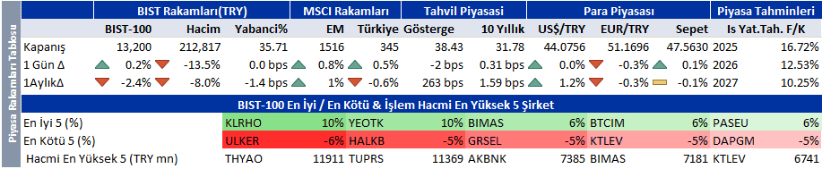BIST piyasalarında oluşan tüm verilere ait telif hakları tamamen BIST’e ait olup, bu veriler tekrar yayınlanamaz. Pay Piyasası, Borçlanma Araçları Piyasası, Vadeli İşlem ve Opsiyon Piyasası verileri BIST kaynaklı en az 15 dakika gecikmeli verilerdir.