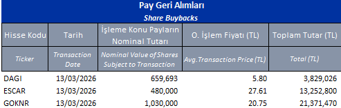 Pay geri alım programları kapsamında ilgili tarihte geri alım yapan şirketlerin listesini aşağıdaki tabloda bulabilirsiniz.