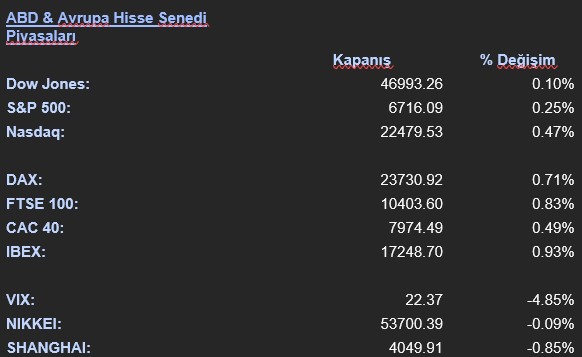 Kurumsal cephede önemli başlıklar öne çıktı. Nvidia CEO’su Jensen Huang’ın Çin pazarı için H200 yapay zeka hızlandırıcılarının üretimine başladıklarını duyurması teknoloji sektöründe yankı buldu. Qualcomm, 20 milyar dolarlık yeni bir hisse geri alım programı ve temettü artışı planladığını açıklarken, Boeing tarafında 737 Max teslimatları ve tedarikçi maliyetlerine ilişkin performans sorunlarının ilk çeyrek sonuçlarını baskılayabileceği sinyali verildi. Eli Lilly hisseleri ise ağırlık kaybı ilaçlarına yönelik beklentilerin aşırı yükseldiği değerlendirmesiyle satış baskısı altında kaldı. Avrupa borsalarında ise daha güçlü bir alıcılı seyir hakimdi. Euro Stoxx 50 %0,53 yükselişle 5.769,25 seviyesine çıkarken, İngiltere FTSE 100 %0,83 ve Almanya DAX %0,71 değer kazandı. İspanya IBEX 35 %0,93 ve İtalya FTSE MIB %1,22 ile bölgenin en güçlü performans gösteren endeksleri oldu.