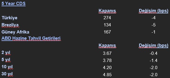 Tahvil piyasalarında Fed’in faiz kararı öncesinde getirilerde aşağı yönlü bir hareket gözlendi. ABD 10 yıllık tahvil faizi 1,6 baz puanlık düşüşle %4,20 seviyesine gerilerken, Kanada 10 yıllık tahvil getirisi %3,38 seviyesinde gerçekleşti. Avrupa tarafında da benzer bir eğilimle getirilerde gevşeme görüldü; Almanya 10 yıllık tahvil faizi %2,90 seviyesine, Fransa %3,55 ve İngiltere %4,69 seviyesine indi. İsviçre %0,29 ile en düşük getiri sunan tahvil olmayı sürdürürken, Yunanistan 10 yıllık tahvil faizi %3,64 olarak kaydedildi. Gelişmekte olan ülke eurotahvillerinde Brezilya %6,17, Meksika %5,87 ve Arjantin %9,95 getiri seviyeleriyle işlem gördü. Piyasadaki risk iştahının göreceli toparlanmasıyla birlikte tahvil fiyatlarında genel bir artış, faiz oranlarında ise sınırlı bir geri çekilme hakim oldu.