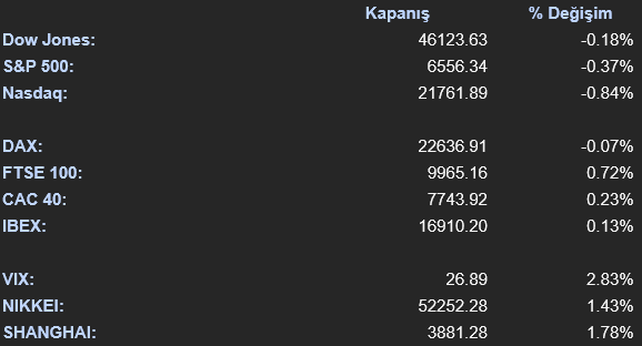 Kapanışta ABD hisse senedi piyasalarında satıcılı bir görünüm izlendi. Dow Jones endeksi %0,18 düşüşle 46.123 seviyesinde kapanırken, S&P 500 endeksi %0,37 gerileyerek 6.556 seviyesine indi. Nasdaq endeksi ise %0,84 kayıpla 21.761 seviyesinde kapanarak teknoloji hisselerindeki zayıf seyrin öne çıktığına işaret etti. Endekslerdeki geri çekilme sınırlı kalırken, büyüme odaklı hisselerde satışların daha belirgin olduğu görüldü. Sektörel görünümde enerji sektörü %2,04 yükselişle günün en güçlü performansını sergilerken, materyaller sektörü %1,67 artışla pozitif ayrıştı. Altyapı sektörü ise %0,74 yükselişle en iyi performans gösteren diğer sektörler arasında yer aldı. Buna karşılık iletişim hizmetleri sektörü %2,50 düşüşle en zayıf performansı gösterdi. Emlak sektörü %0,76 gerilerken bilgi teknolojileri sektörü %0,71 düşüşle en zayıf performans gösteren diğer sektörler arasında yer aldı. Avrupa hisse senedi piyasalarında ise karışık bir kapanış izlendi. Euro Stoxx 50 endeksi %0,13 yükselişle 5.581 seviyesinde kapanırken, İngiltere FTSE 100 endeksi %0,72 artışla 9.965 seviyesine yükseldi. Fransa CAC 40 endeksi %0,23 primle 7.743 seviyesinde kapanırken Almanya DAX endeksi %0,07 düşüşle 22.636 seviyesinde günü tamamladı. Avrupa piyasalarında genel olarak yatay ve sınırlı pozitif bir görünüm öne çıktı.