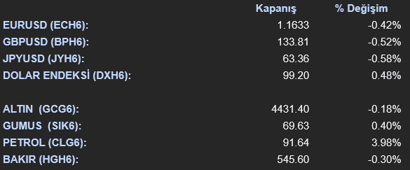 Döviz piyasalarında dolar endeksi (DXH6) %0,48 yükselişle 99,20 seviyesine çıkarken majör para birimlerinde dolar karşısında değer kayıpları izlendi. EUR/USD paritesi (ECH6) %0,42 düşüşle 1,1633 seviyesine gerilerken, GBP/USD (BPH6) %0,53 kayıpla 133,80 seviyesinde fiyatlandı. JPY/USD (JYH6) ise %0,57 düşüşle 63,36 seviyesinde işlem gördü. Dolar endeksindeki yükseliş, Orta Doğu kaynaklı jeopolitik risklerin devam etmesi ve artan tahvil getirilerinin dolar talebini desteklemesiyle ilişkilendirildi. Spot altın %0,15 düşüşle 4.400,77 dolar seviyesine gerilerken spot gümüş %0,59 yükselişle 69,54 dolar seviyesinde işlem gördü. Vadeli işlemler tarafında ise altın kontratı (GCG6) %0,14 düşüşle 4.433,10 seviyesine gerilerken gümüş (SIK6) %0,53 artışla 69,73 seviyesinde fiyatlandı. Değerli metallerdeki sınırlı seyir, doların güç kazanması ve tahvil getirilerindeki yükselişin baskı yaratmasına rağmen jeopolitik risklerin aşağı yönü sınırlamasıyla dengelendi. Enerji piyasasında güçlü yükselişler öne çıktı. WTI ham petrol (CLG6) %3,97 artışla 91,63 dolar seviyesine yükselirken Brent petrol %3,49 primle 103,43 dolar seviyesinde işlem gördü. Hürmüz Boğazı’na ilişkin gelişmeler ve Orta Doğu’daki jeopolitik risklerin enerji arzını sekteye uğratabileceğine yönelik endişeler petrol fiyatlarını yukarı taşıdı. Doğal gaz tarafında ise ayrışma izlendi. ABD doğal gazı %1,52 yükselirken Avrupa TTF kontratı %4,66 düşüş kaydetti. Endüstriyel metaller tarafında karışık bir seyir izlendi. LME alüminyum %1,92 artışla 3.260,50 dolar seviyesine yükselirken LME bakır %0,55 düşüşle 12.100,50 dolar seviyesine geriledi. Vadeli bakır kontratı (HGH6) ise %0,30 düşüşle 545,60 seviyesinde işlem gördü. Nikel %0,77 düşüş kaydederken demir cevheri %0,67 yükseldi. Baz metallerdeki bu görünüm, küresel büyüme endişeleri ile arz taraflı gelişmelerin birlikte fiyatlanmaya devam ettiğine işaret ediyor.