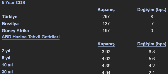 ABD tahvil piyasasında gün genelinde satış baskısının sürdüğü görüldü. Getiriler eğri boyunca yükselirken özellikle kısa ve orta vadeli tahvillerde artış dikkat çekti. ABD 2 yıllık tahvil getirisi 6,9 baz puan artışla %3,921 seviyesine yükselirken, 3 yıllık getiri 6,2 baz puan artışla %3,927 seviyesinde oluştu. 5 yıllık tahvil getirisi 5,6 baz puan artışla %4,021 seviyesine çıkarken, 7 yıllık getiri 5,3 baz puan yükselerek %4,206 seviyesine ulaştı. ABD 10 yıllık tahvil getirisi ise 4,4 baz puan artışla %4,386 seviyesine yükseldi. Getirilerdeki yukarı yönlü hareket, yükselen petrol fiyatları ve jeopolitik risklerin enflasyon beklentilerini desteklemesiyle tahvil piyasasında satışların devam ettiğine işaret etti. Avrupa tahvil piyasalarında da benzer şekilde satıcılı bir seyir izlendi. İngiltere 10 yıllık tahvil getirisi %4,956 seviyesine yükselirken, Fransa 10 yıllık tahvil getirisi %3,755 seviyesinde oluştu. Almanya 10 yıllık tahvil getirisi %3,024 seviyesine çıkarken, İtalya 10 yıllık tahvil getirisi %3,949 seviyesinde izlendi. İspanya 10 yıllık tahvil getirisi %3,559 seviyesine yükselirken, Portekiz 10 yıllık tahvil getirisi %3,506 seviyesinde gerçekleşti. Veriler, Avrupa genelinde tahvil fiyatlarında baskının sürdüğünü gösterdi. Gelişmekte olan ülke tahvil piyasalarında ise getirilerde ağırlıklı olarak yukarı yönlü hareket öne çıktı. Brezilya 10 yıllık USD tahvil getirisi %6,313 seviyesine yükselirken, Meksika 10 yıllık USD tahvil getirisi %6,132 seviyesinde oluştu. Arjantin 10 yıllık USD tahvil getirisi %10,352 seviyesine çıkarken, Şili 10 yıllık USD tahvil getirisi %5,079 seviyesinde fiyatlandı. Katar 10 yıllık USD tahvil getirisi %4,606 seviyesinde sınırlı artış gösterirken, Suudi Arabistan 10 yıllık USD tahvil getirisi %5,286 seviyesinde hafif geriledi. Filipinler 10 yıllık USD tahvil getirisi %5,411 seviyesine gerilerken, Endonezya 10 yıllık USD tahvil getirisi %5,452 seviyesinde izlendi. Peru 10 yıllık USD tahvil getirisi %5,482 seviyesine yükselirken, Kolombiya 10 yıllık USD tahvil getirisi %7,116 seviyesinde oluştu. Türkiye 10 yıllık USD tahvil getirisi ise %7,394 seviyesine yükselirken ülke risk priminde artış eğilimi dikkat çekti. Türkiye’nin 5 yıllık CDS risk primi gün sonunda 7,9 puan artışla 297,287 seviyesine yükselerek risk algısındaki bozulmanın sürdüğüne işaret etti.