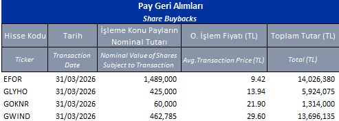 Pay geri alım programları kapsamında ilgili tarihte geri alım yapan şirketlerin listesini aşağıdaki tabloda bulabilirsiniz.