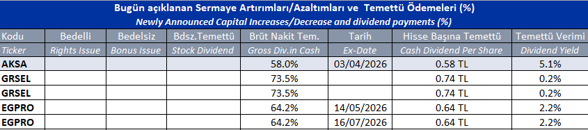 Gün içinde çıkmış veya bu sabah seans açılmadan önce açıklanmış sermaye artırımları ve temettü ödemeleri aşağıdaki tabloda görüntülenmektedir.