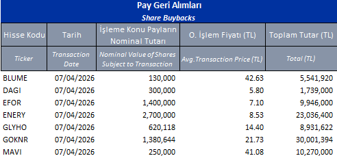 Pay geri alım programları kapsamında ilgili tarihte geri alım yapan şirketlerin listesini aşağıdaki tabloda bulabilirsiniz.