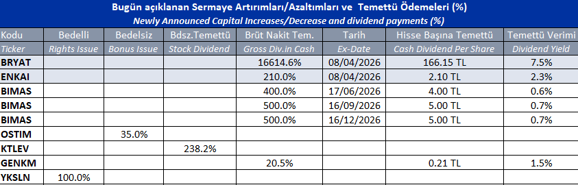 Gün içinde çıkmış veya bu sabah seans açılmadan önce açıklanmış sermaye artırımları ve temettü ödemeleri aşağıdaki tabloda görüntülenmektedir.