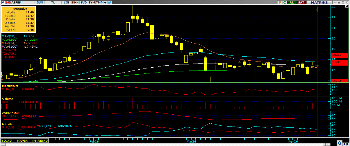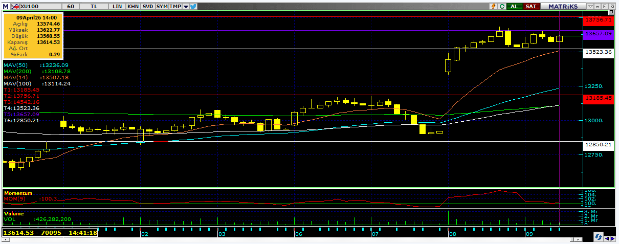 Endeks için kısa vadede 13.650 ve 13.750 seviyeleri direnç, 13.500 destek olarak öne çıkıyor. Savaşın başında gelen satış ile birlikte oluşan boşluğun üzerine çıkmış olması endeksi pozitif bir alanda tutuyor. 13.500-13.650 arası yatay konsolidasyon makul, desteğin altı yeniden boşluğun içine sokacağından kısa vade de zayıflık getirebilir.