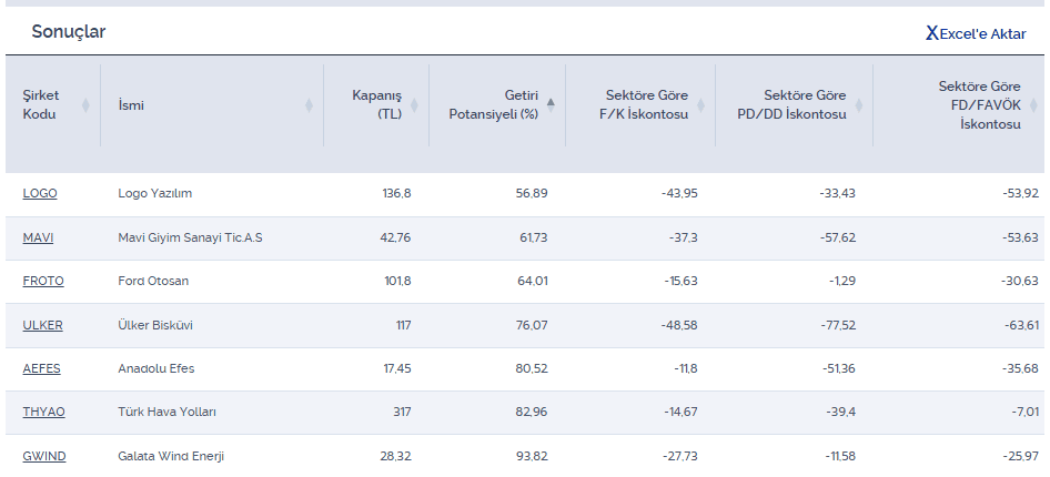 Sektörüne göre iskontolu ve %50 üzeri getiri potansiyeli olan şirketler listesini aşağıda inceleyebilirsiniz.