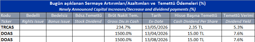 Gün içinde çıkmış veya bu sabah seans açılmadan önce açıklanmış sermaye artırımları ve temettü ödemeleri aşağıdaki tabloda görüntülenmektedir.
