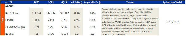 ARCLK.IS: 1Ç26 Kar Tahmini