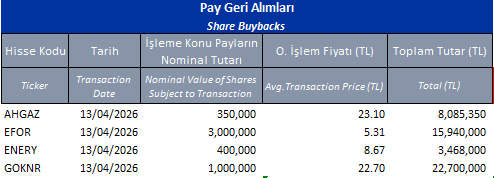 Pay geri alım programları kapsamında ilgili tarihte geri alım yapan şirketlerin listesini aşağıdaki tabloda bulabilirsiniz.