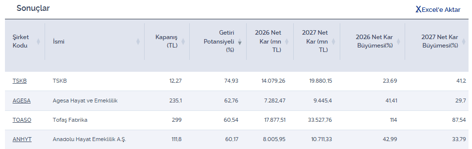 2026&27’de en az %20 kar büyümesi beklenen ve %60 üzeri getiri potansiyeli olan şirketler listesini aşağıda inceleyebilirsiniz.