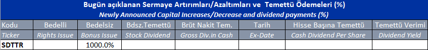 Gün içinde çıkmış veya bu sabah seans açılmadan önce açıklanmış sermaye artırımları ve temettü ödemeleri aşağıdaki tabloda görüntülenmektedir.