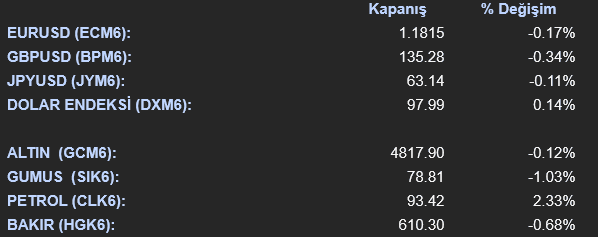 Döviz piyasalarında dolar endeksi (DXM6) %0,14 artışla 97,99 seviyesine yükselirken majör para birimlerinde dolar karşısında zayıf bir görünüm izlendi. EUR/USD paritesi (ECM6) %0,17 düşüşle 1,1815 seviyesine gerilerken, GBP/USD (BPM6) %0,34 kayıpla 135,28 seviyesinde fiyatlandı. JPY/USD (JYM6) ise %0,11 düşüşle 63,14 seviyesinde işlem gördü. Dolar endeksindeki sınırlı yükseliş, jeopolitik risklerin devam etmesi ve yatırımcıların temkinli duruşunu korumasıyla ilişkilendirildi. Değerli metaller tarafında karışık bir seyir öne çıktı. Spot altın sınırlı yükseliş kaydederken, vadeli işlemler tarafında altın kontratı (GCM6) %0,12 düşüşle 4.817,90 seviyesine geriledi. Gümüş tarafında ise zayıf görünüm dikkat çekti; spot gümüş gerilerken, gümüş kontratı (SIK6) %1,03 kayıpla 78,81 seviyesinde fiyatlandı. Değerli metallerdeki bu görünüm, güçlü dolar ve faizlerdeki yukarı yönlü eğilimin baskı yaratmaya devam ettiğine işaret ederken, jeopolitik riskler fiyatlarda aşağı yönü sınırlayan unsur olmaya devam ediyor. Enerji piyasasında yukarı yönlü hareketler öne çıktı. WTI ham petrol (CLK6) %2,33 artışla 93,42 dolar seviyesine yükselirken, Brent petrol %3,37 primle 98,13 dolar seviyesinde fiyatlandı. Doğal gaz tarafında da pozitif bir görünüm izlendi; ABD doğal gazı %2,18 artışla 2,67 seviyesine yükselirken, Avrupa TTF kontratı %1,67 primle 42,09 seviyesinde işlem gördü. Enerji fiyatlarındaki yükseliş, arz tarafına yönelik risklerin devam etmesi ve Orta Doğu kaynaklı jeopolitik gelişmelerle desteklendi. Endüstriyel metaller tarafında ise genel olarak sınırlı pozitif bir seyir izlendi. LME alüminyum %0,61 artışla 3.643,50 dolar seviyesine yükselirken, bakır %0,17 primle 13.270,50 dolar seviyesinde fiyatlandı. Nikel %0,58 artışla 18.239 dolar seviyesine ulaşırken, demir cevheri %0,45 yükseliş kaydetti. Vadeli bakır kontratı (HGK6) ise %0,68 düşüşle 610,30 seviyesinde fiyatlandı. Baz metallerdeki bu karışık görünüm, küresel büyüme beklentilerine ilişkin temkinli iyimserliğin sürdüğüne işaret ediyor.