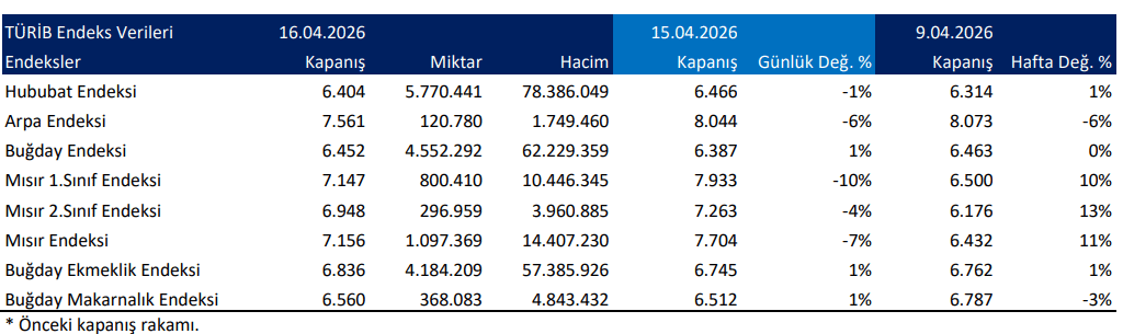 Veriler Türkiye Ürün ve İhtisas Borsası A.Ş. (TÜRİB) tarafından sağlanmakta olup, gecikmeli ve kamuya açık olarak yayımlanan www.turib.com.tr üzerinden temin edilmektedir.