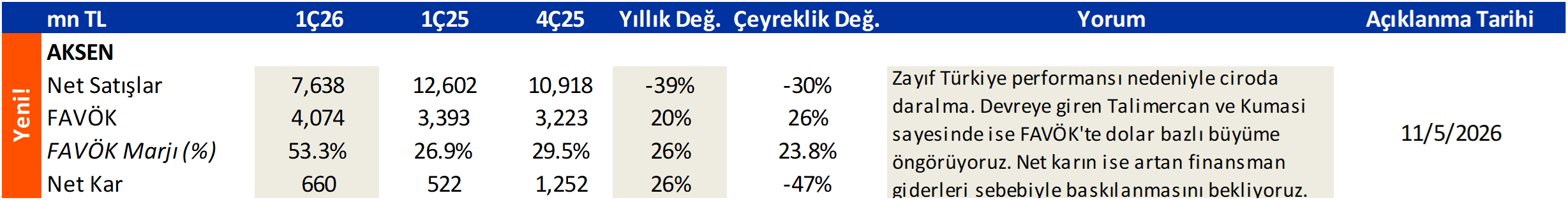 AKSEN.IS: 1Ç26 Kar Tahmini