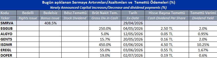 Gün içinde çıkmış veya bu sabah seans açılmadan önce açıklanmış sermaye artırımları ve temettü ödemeleri aşağıdaki tabloda görüntülenmektedir.
